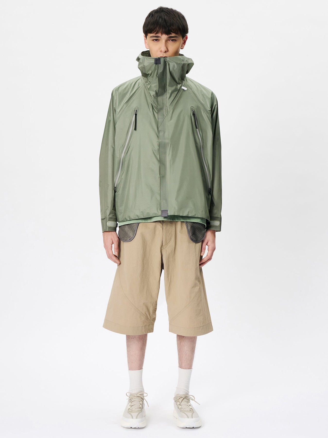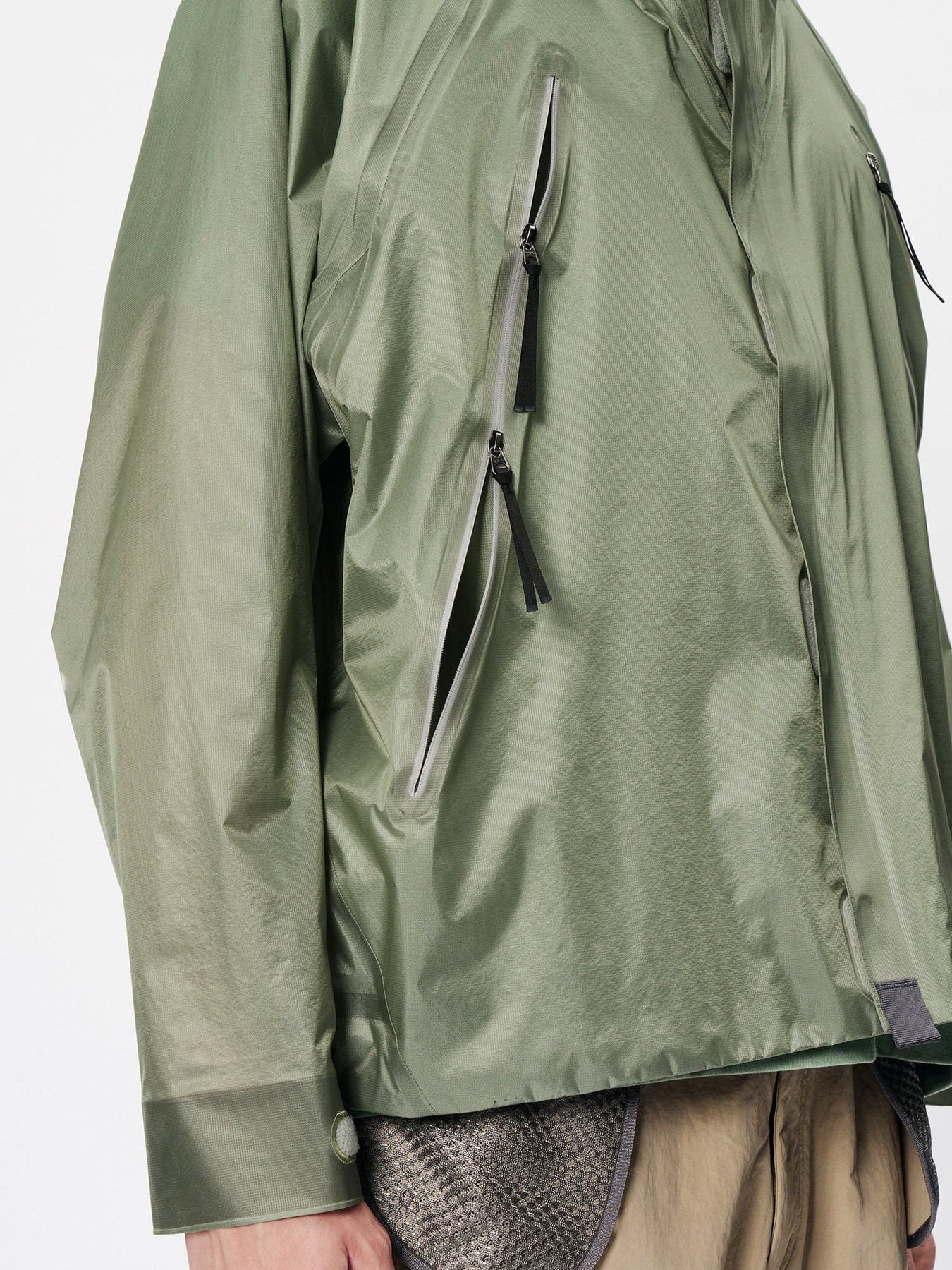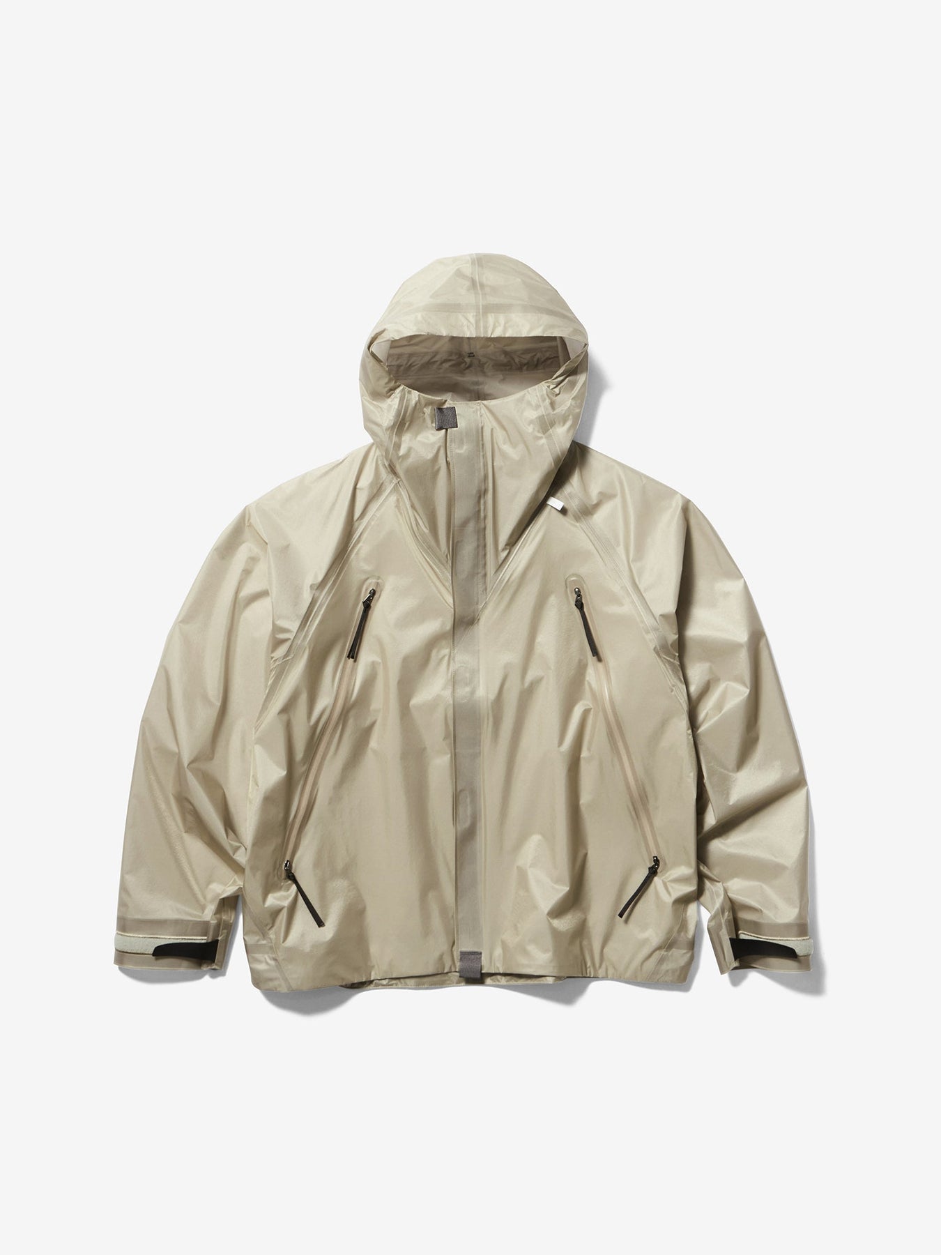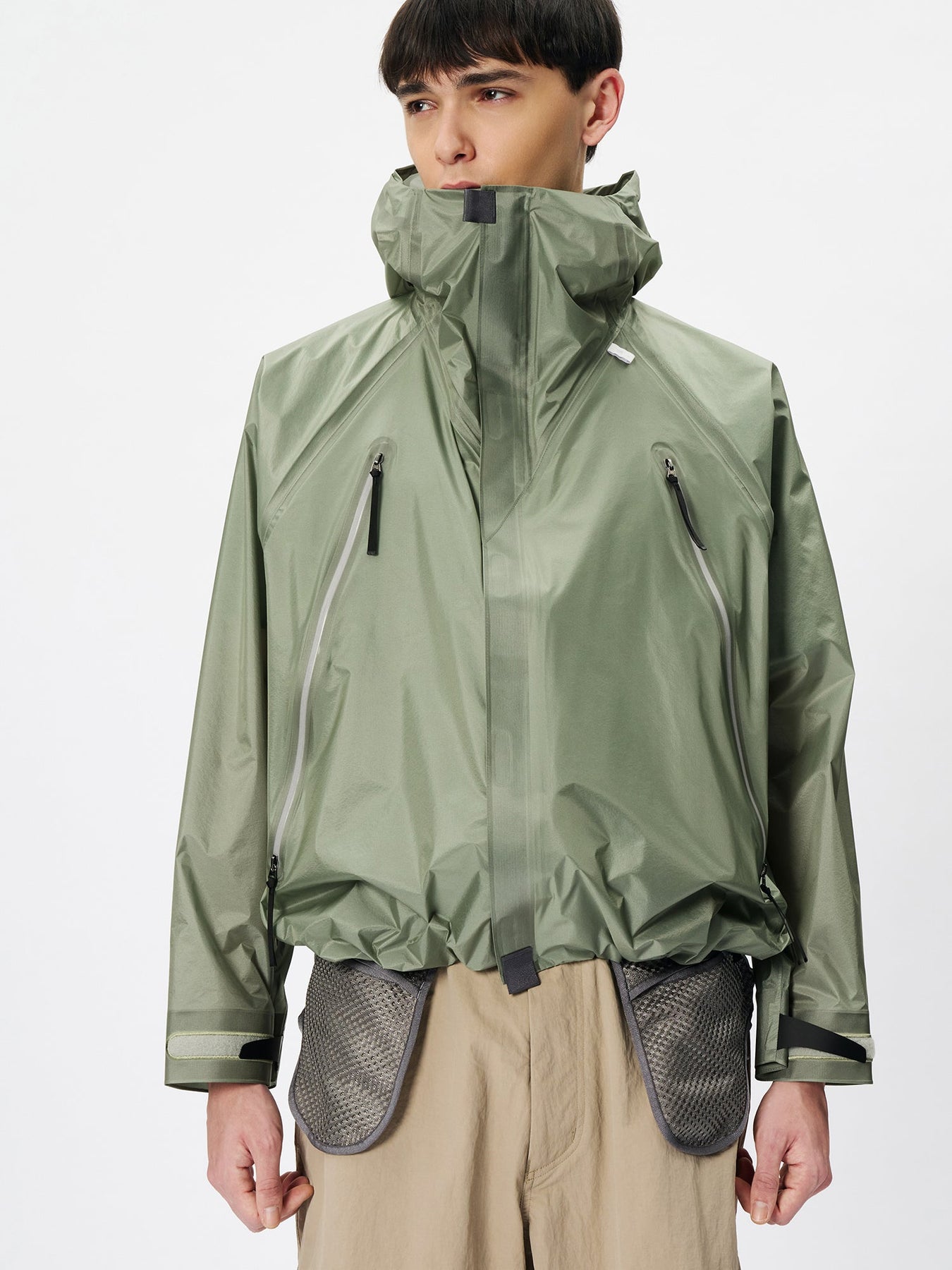 This waterproof jacket is constructed with a 3-layer fabric and fully seam-sealed construction. It features an exceptionally lightweight, translucent nylon material that offers both waterproofness and breathability. The linear cutting creates a distinctive, architectural silhouette. A high stand collar and hood provide enhanced protection in rainy conditions. When the long side zippers are opened, laser-cut holes inside the pockets function as ventilation, improving airflow.