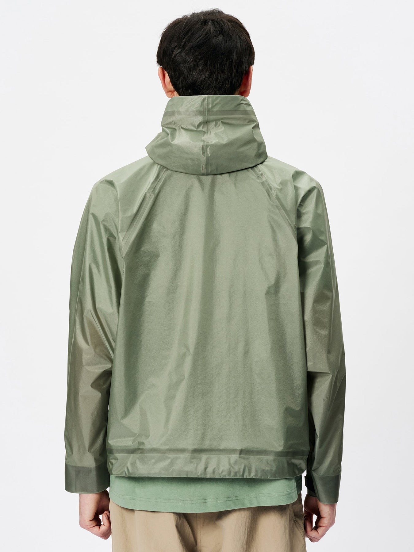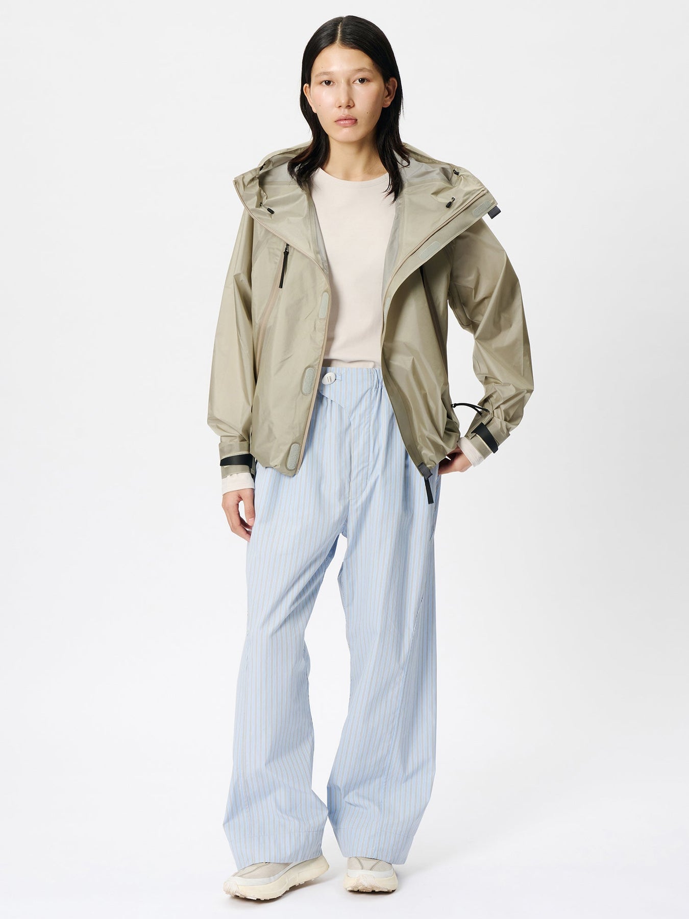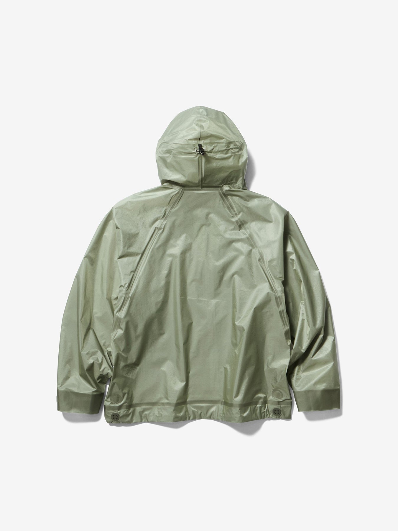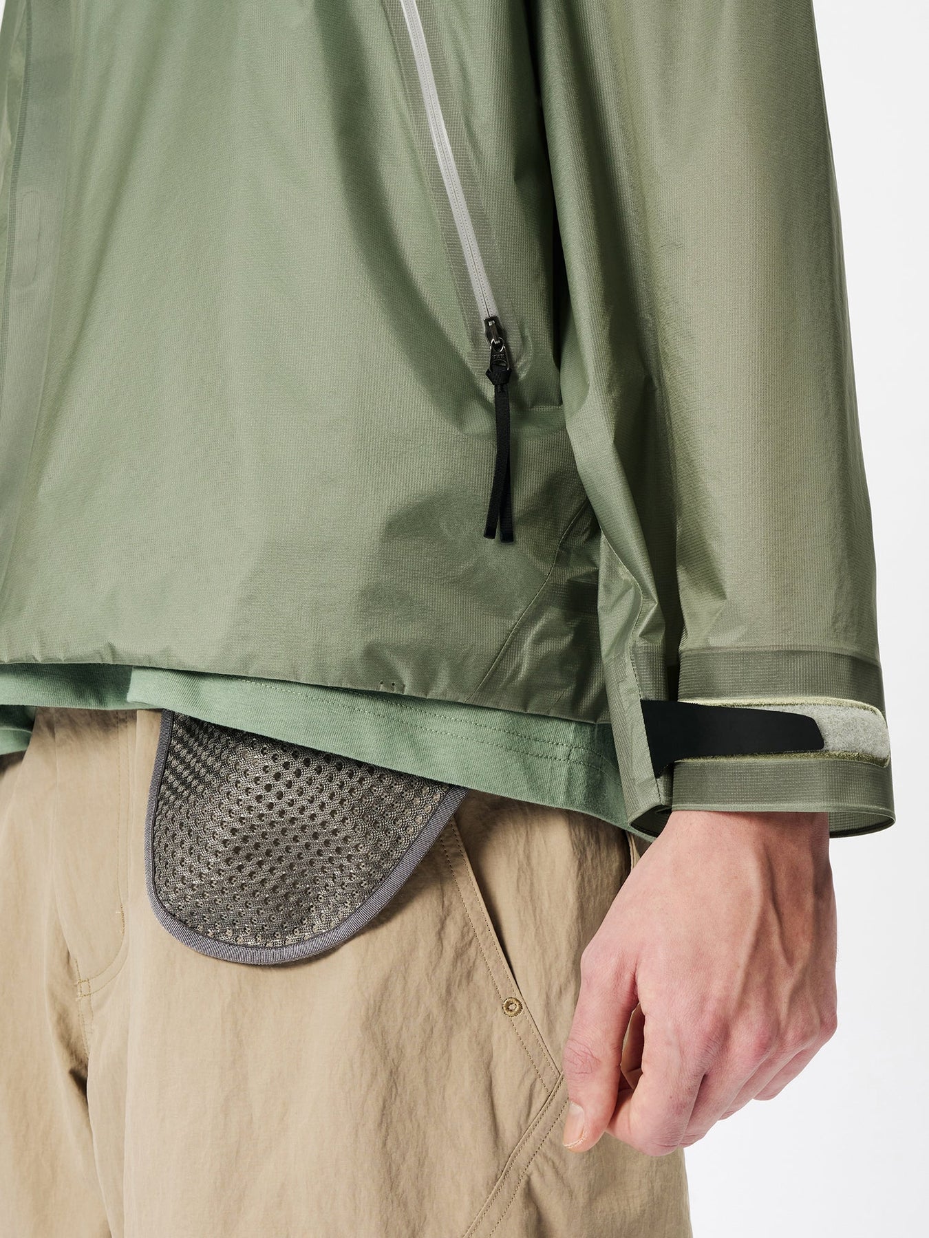 This waterproof jacket is constructed with a 3-layer fabric and fully seam-sealed construction. It features an exceptionally lightweight, translucent nylon material that offers both waterproofness and breathability. The linear cutting creates a distinctive, architectural silhouette. A high stand collar and hood provide enhanced protection in rainy conditions. When the long side zippers are opened, laser-cut holes inside the pockets function as ventilation, improving airflow.