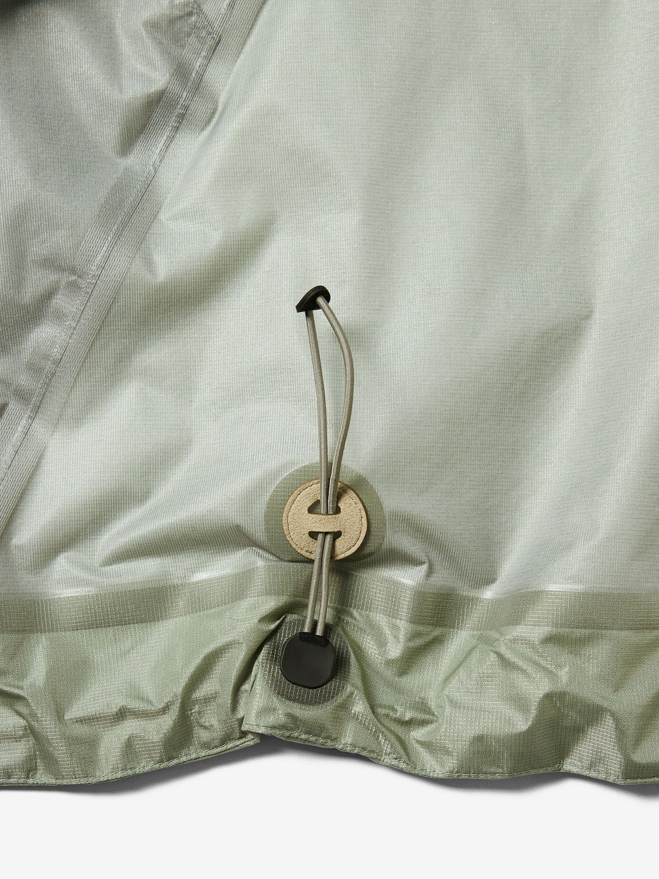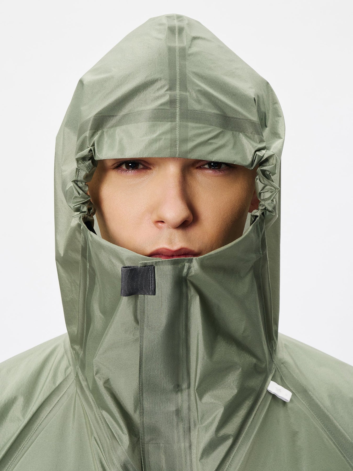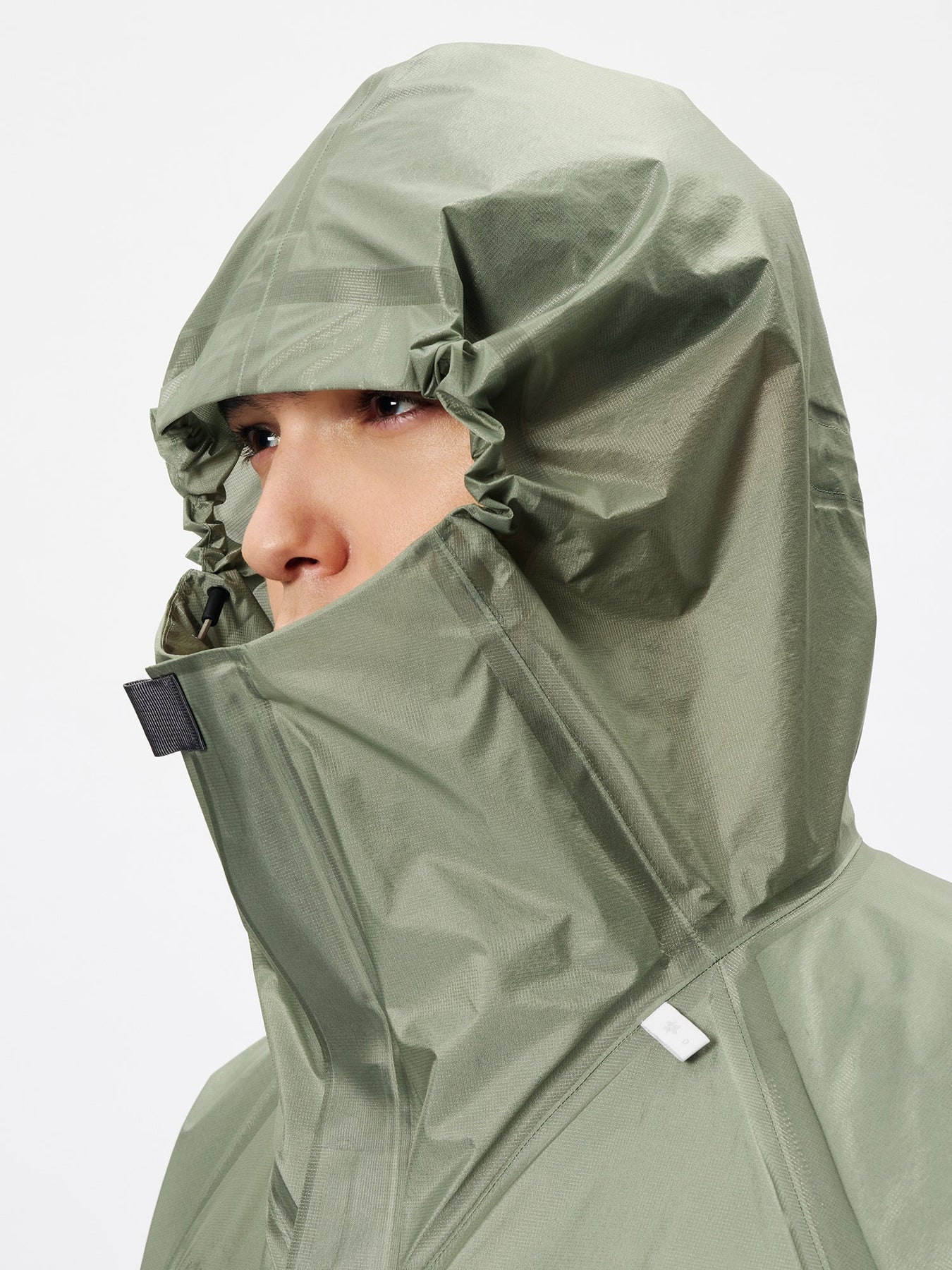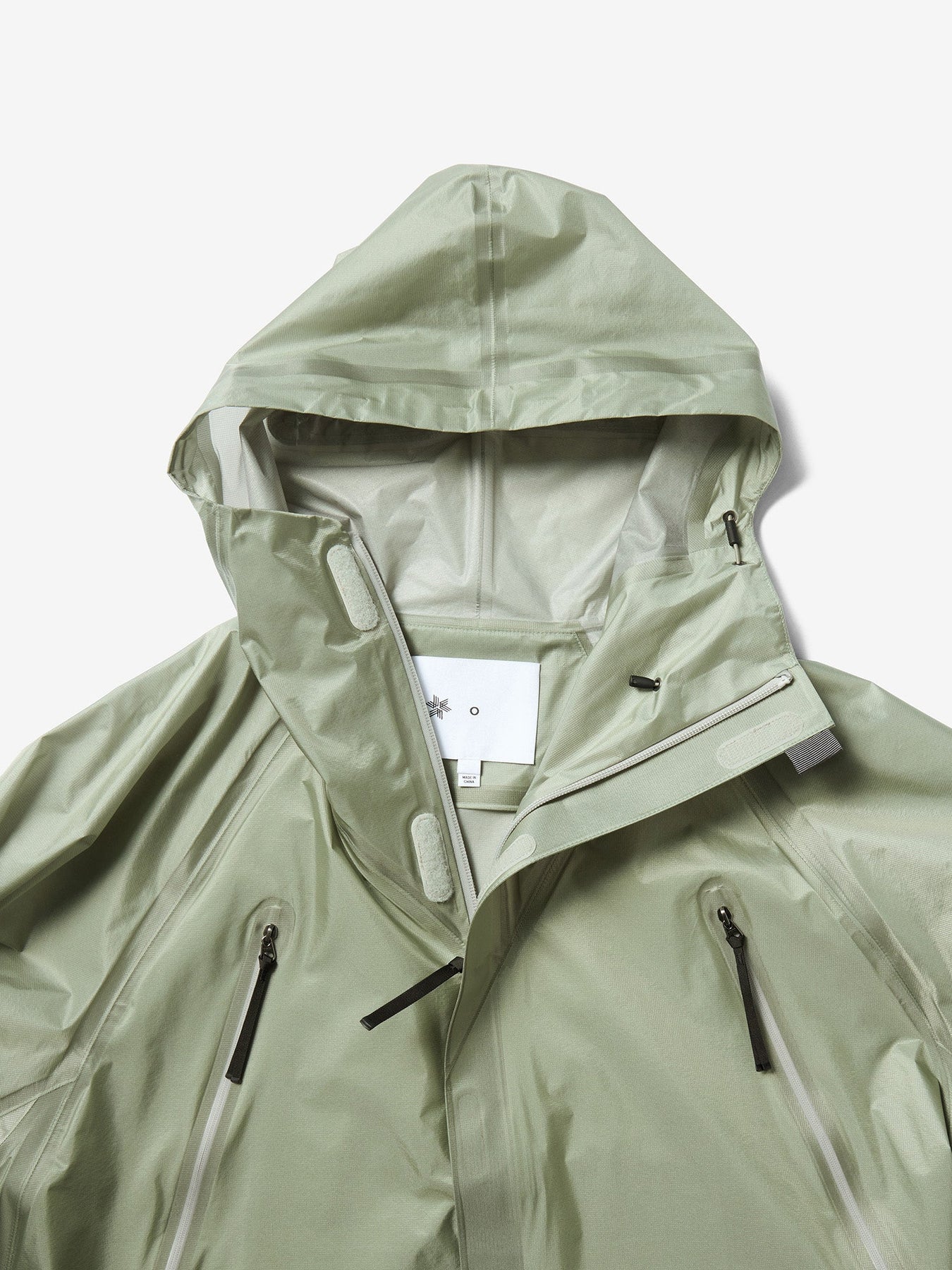 This waterproof jacket is constructed with a 3-layer fabric and fully seam-sealed construction. It features an exceptionally lightweight, translucent nylon material that offers both waterproofness and breathability. The linear cutting creates a distinctive, architectural silhouette. A high stand collar and hood provide enhanced protection in rainy conditions. When the long side zippers are opened, laser-cut holes inside the pockets function as ventilation, improving airflow.