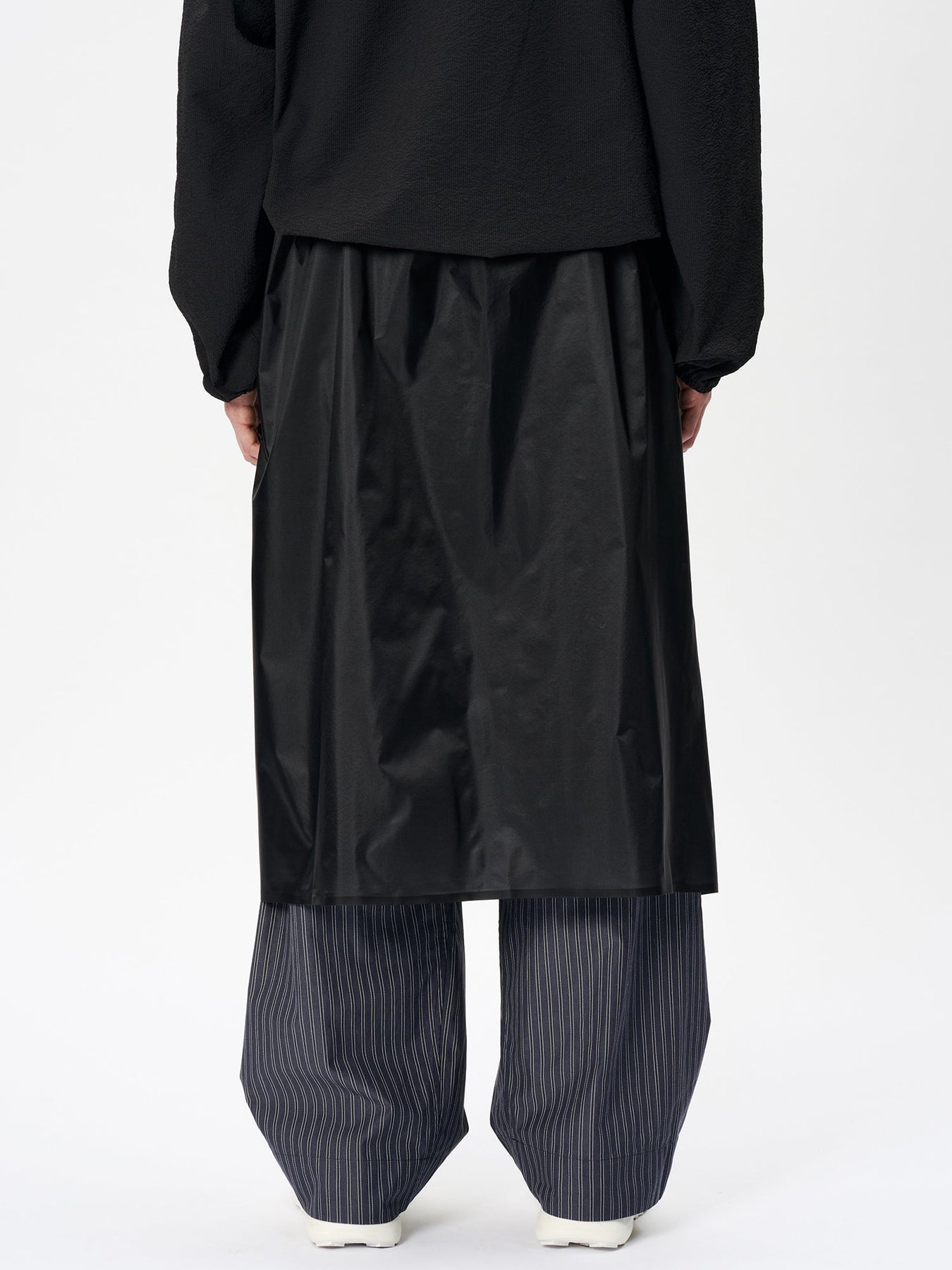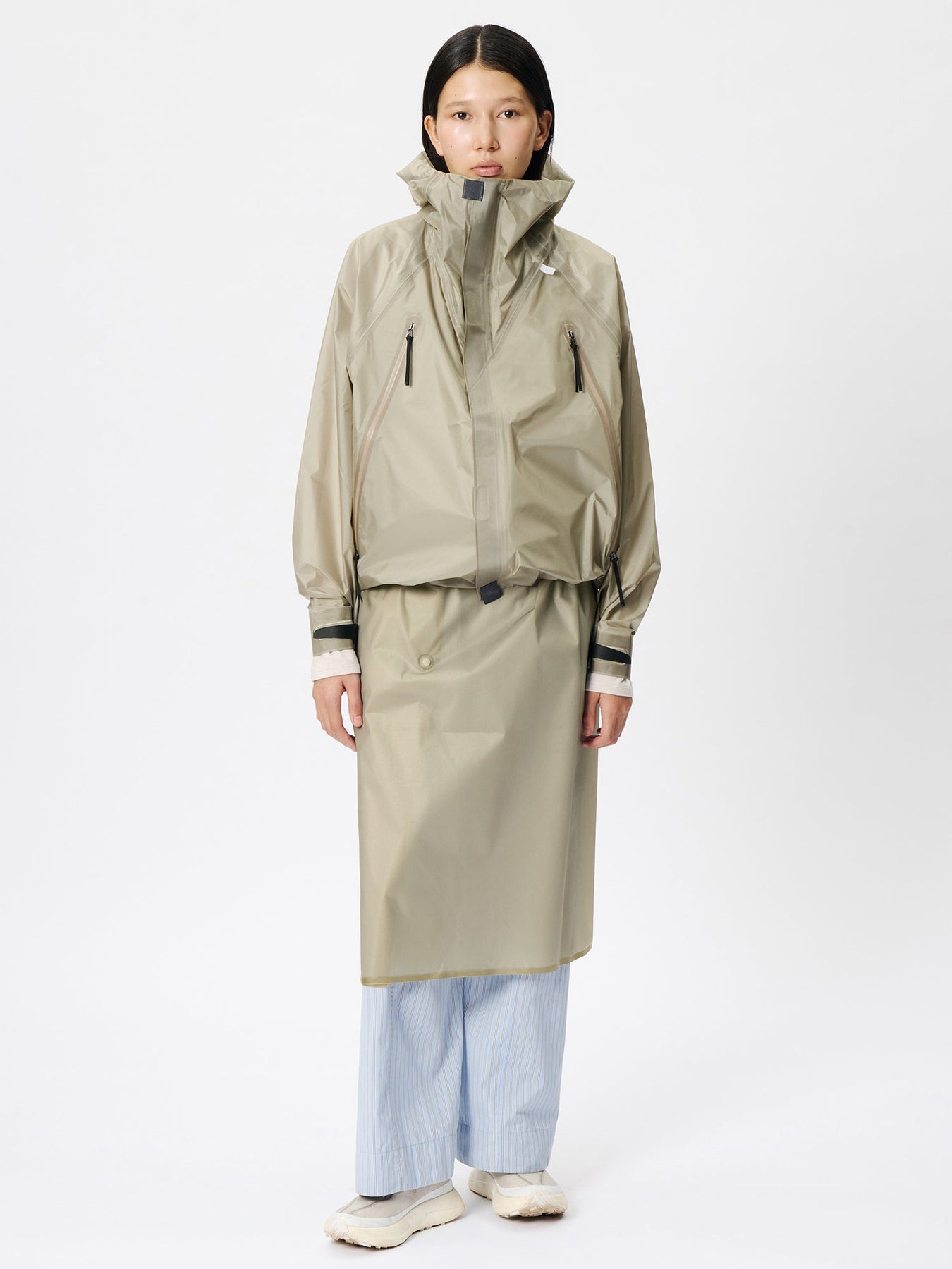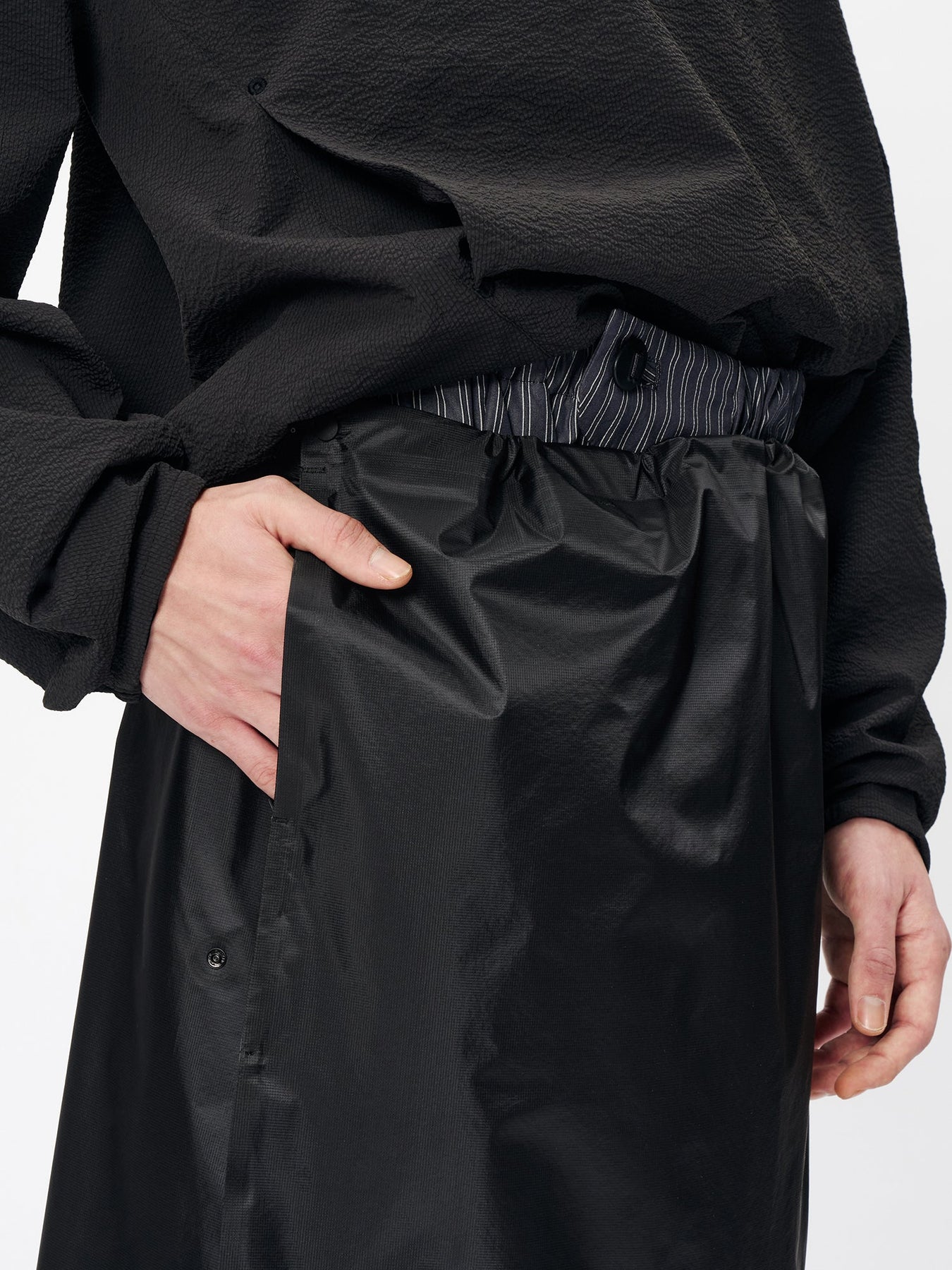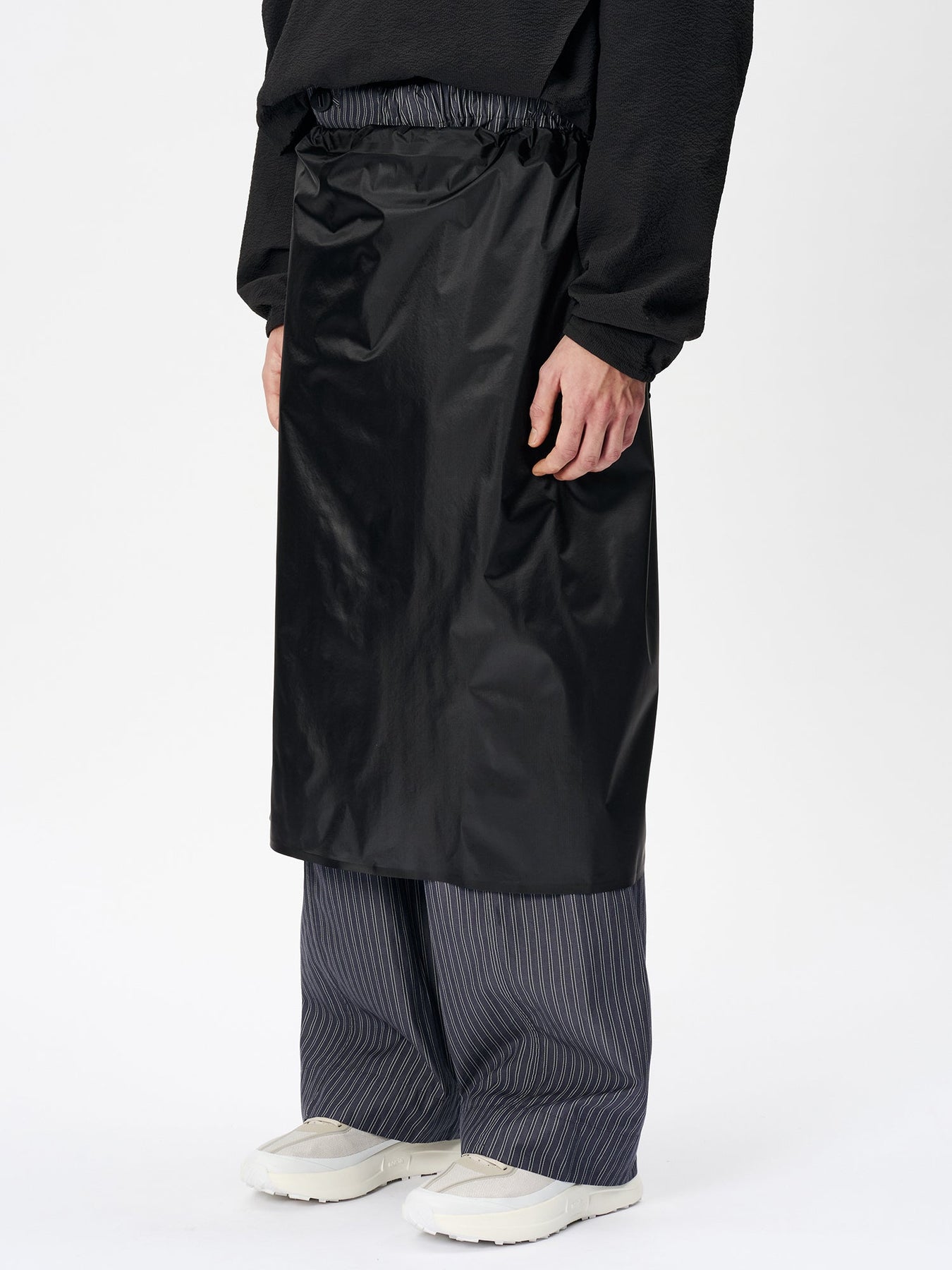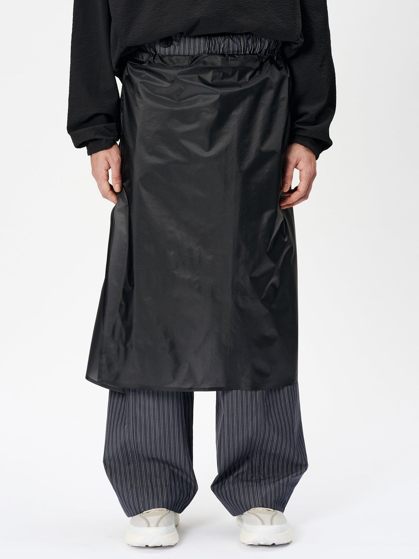 This waterproof rain wrap is made with 3-layer fabric and fully seam-sealed construction. It features an exceptionally lightweight, translucent nylon material that offers both waterproofness and breathability. Easier to put on than traditional rain pants, it protects the lower body from rain while remaining convenient to wear. The waist is adjustable with a drawcord, and the wrap is packable into its side pocket for compact storage.
