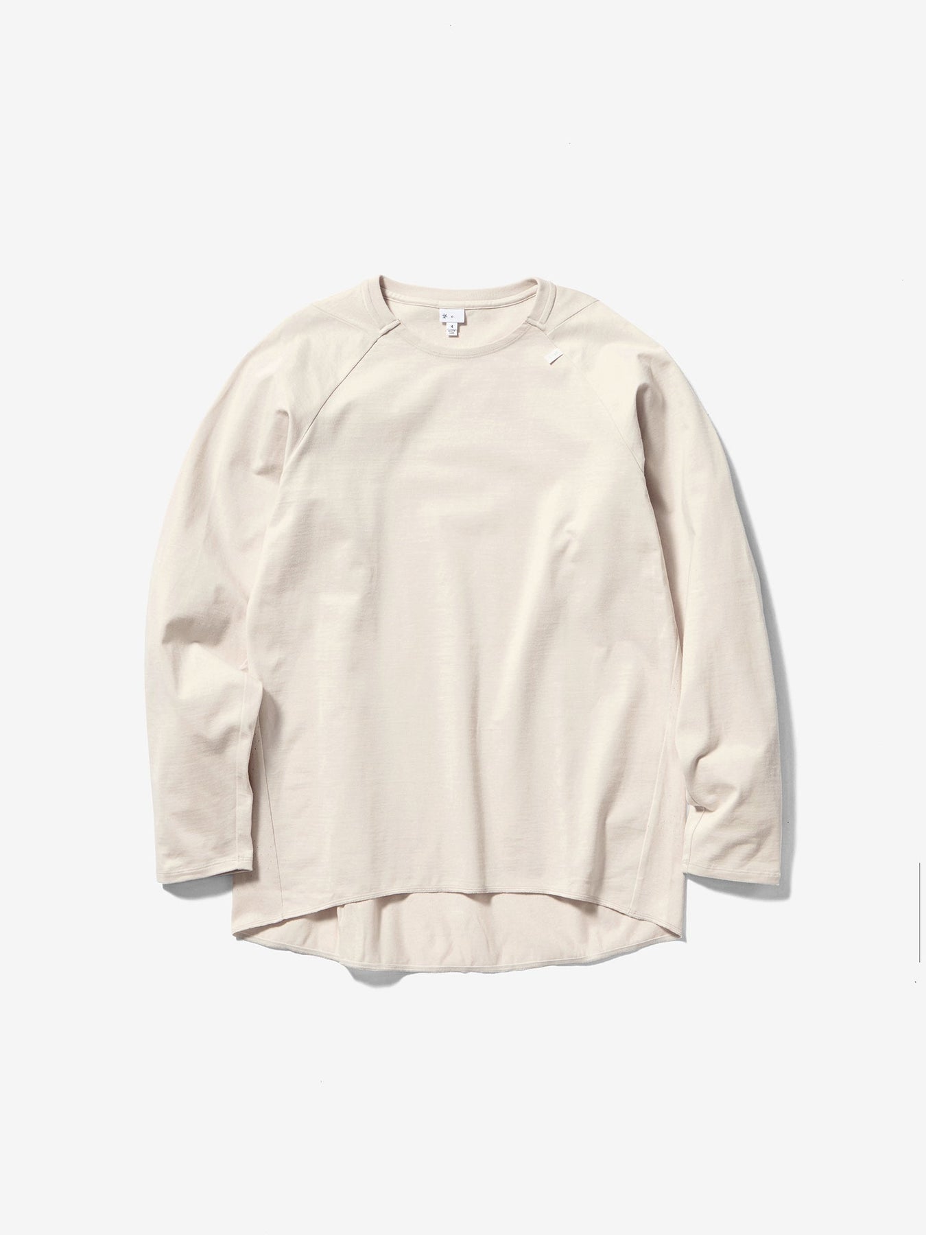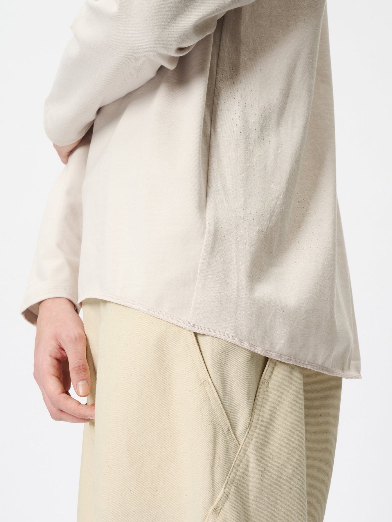 This technical long-sleeve T-shirt is crafted primarily from cotton. The front features a soft organic cotton jersey, while the back is made from a cotton-polyester mesh. The mesh placement is strategically designed based on the body’s sweat map, optimizing ventilation. It brings the performance-inspired ideas of high-tech T-shirts to a casual, cotton-focused silhouette for everyday wear.