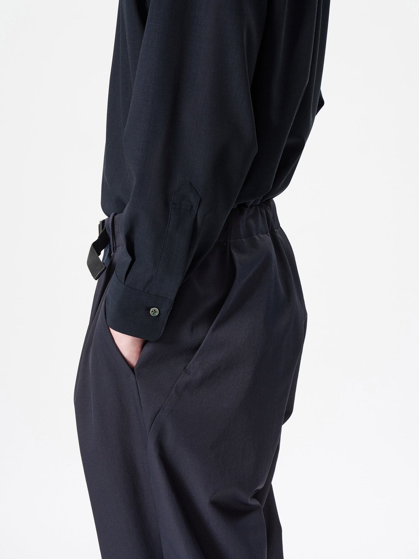 • The back pockets are positioned utilizing the curved transition that follows the hip line. It has large storage capacity and works as a design accent for a simple outfit.